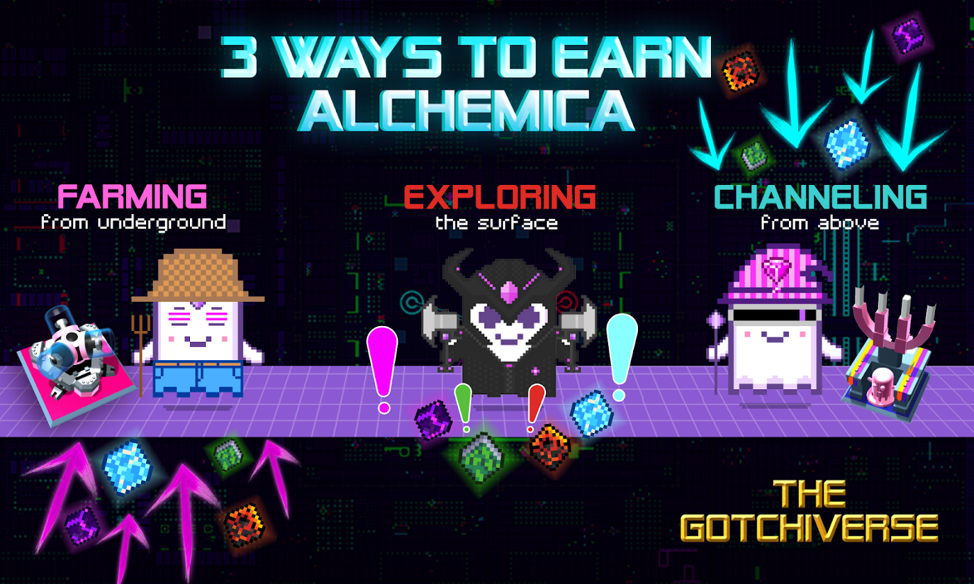 Gotchus Alchemica are ERC-20 tokens you are all familiar with. Collecting Alchemica through means of exploring the surface, crafting farming installations, and participating in channeling ceremonies with guilds will become the primary means of earning in the Gotchiverse Realm.