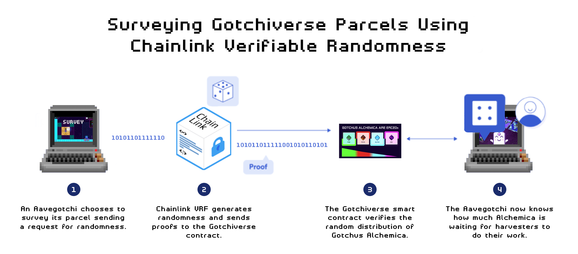 “We’re excited to be using Chainlink VRF to help determine an unpredictable amount of Alchemica tokens that users can harvest when they mint a parcel of land in the Gotchiverse,” said founder and COO of Pixelcraft Studios, Jesse Johnson. “Not only do the randomized token allocations make our game more engaging, but using a secure source of on-chain randomness helps make our project more transparent.”