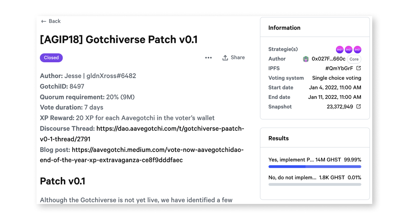 - Link to matching discourse thread in the AavegotchiDAO Forum (proposals without significant discussion in the forums will be automatically removed from Snapshot)