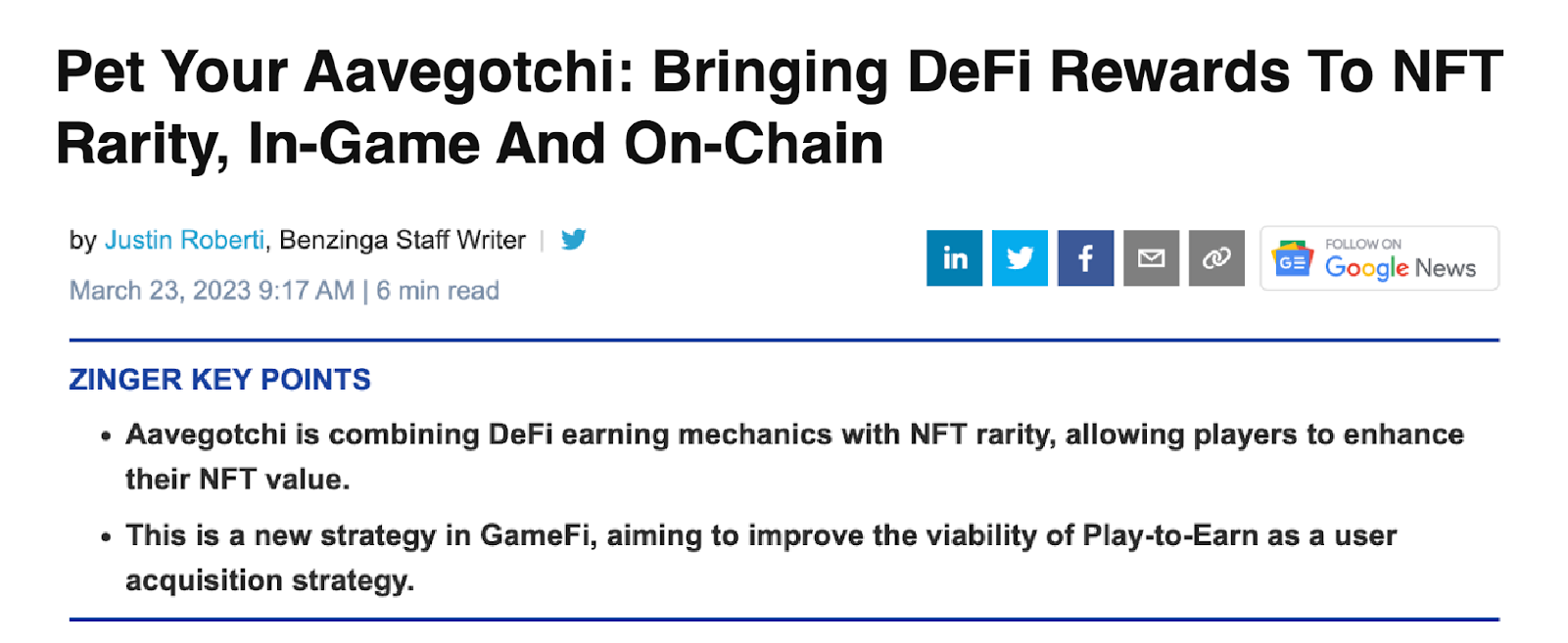 Aavegotchi has been featured in numerous well known media outlets like CoinDesk, Cointelegraph, The Block, Benzinga and Yahoo Finance. In addition, we’ve gained tons of recognition across the wider NFT space in market reports, Twitter spaces, and IRL events. Let’s take a look at some recent examples of Aavegotchi in the news!