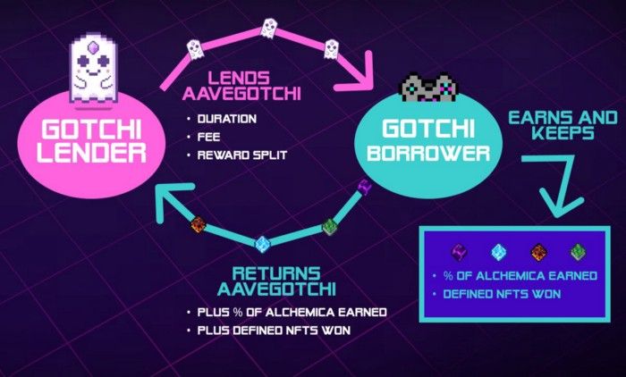 Other options are highlighted in the Gotchi Lending program, a revolutionary play-to-earn concept that eliminates the need for a middle-man in the process of earning payouts. This eliminates delays, confusion, and possible foul play. Players can simply lend out Gotchiverse REALM parcels or Aavegotchis for others to use, and split the Alchemica gathered by the borrower.