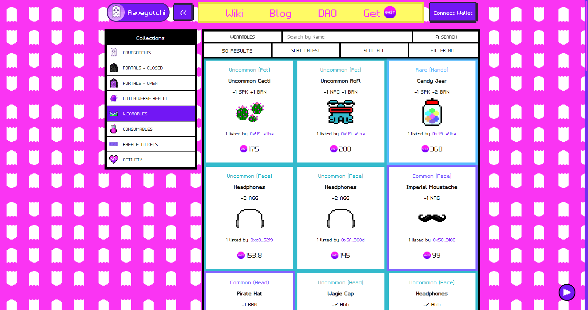 Equipping certain Wearables together on your Aavegotchi comes with a “set bonus.” The set bonus increases the effect on BRS beyond the increase from each individual Wearable. There are quite a few awesome Wearable Sets, the challenge is finding the one you like best that also goes well with your Aavegotchi’s traits! For all the info on Wearable Sets click here.