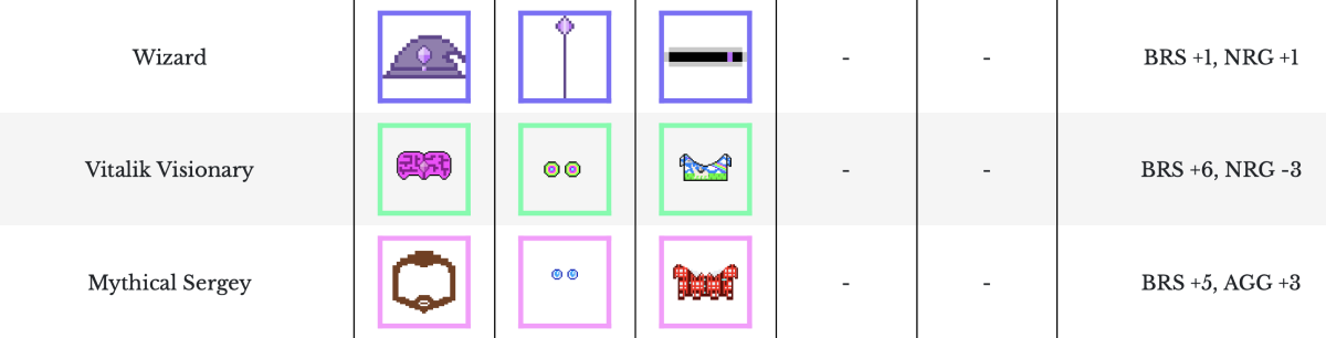 Choosing which Wearable is right for your Aavegotchi depends on their traits. In addition to the BRS increase based on rarity, Wearables can modify four of your Aavegotchi’s traits: Aggressiveness, Energy, Spookiness, and Brain Size.