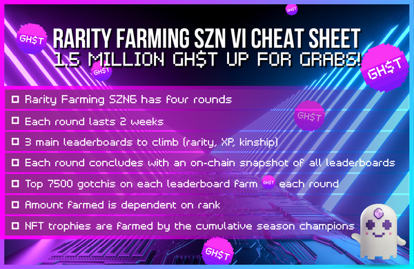 The first snapshot of Rarity Farming Season 6 will commence two weeks from today, on June 29th 2023 at 10am EST/2pm UTC, so make sure to have your GotchiGang's outfits ready to go before then to earn those taasty GHST rewards.