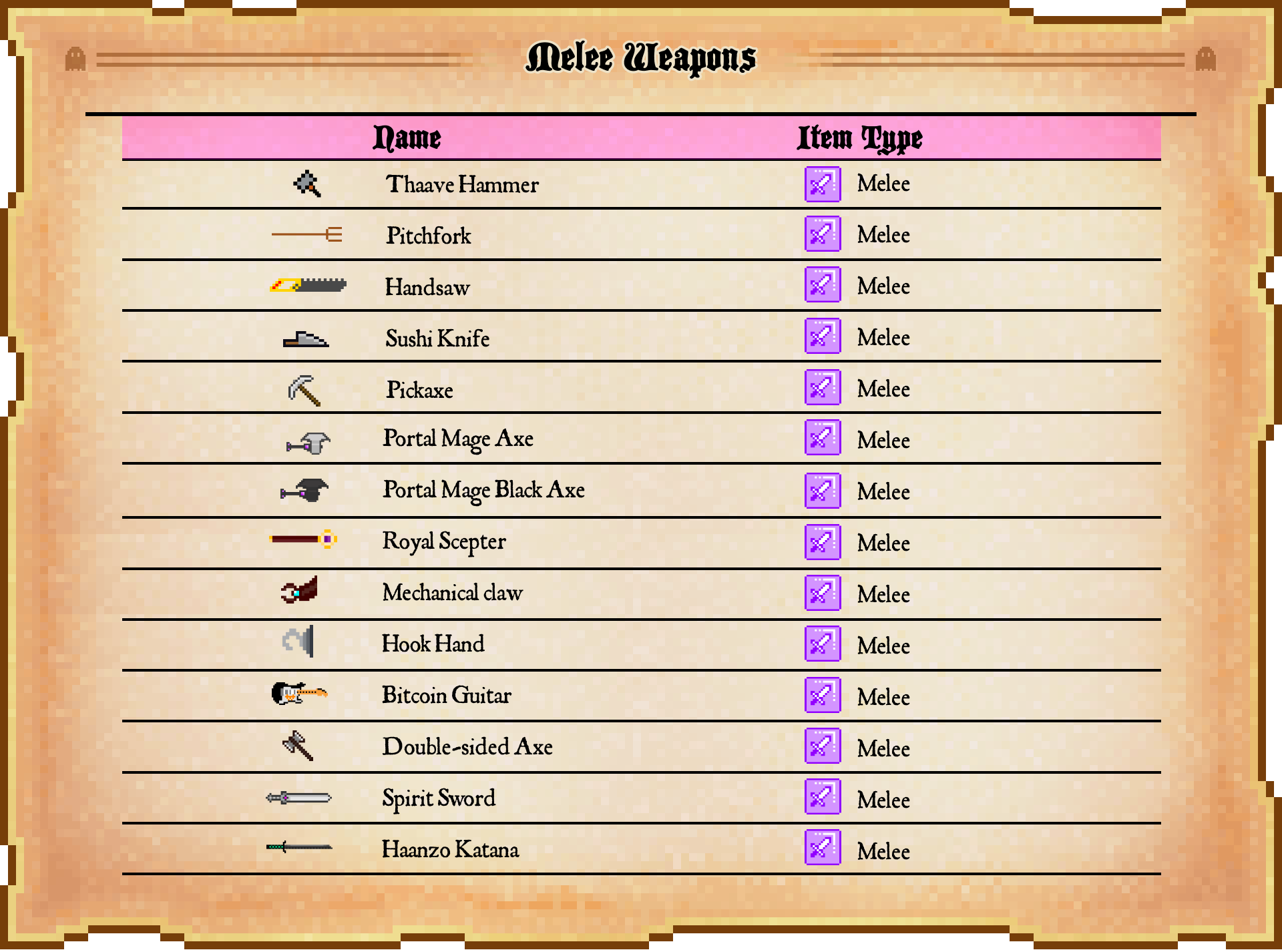 Weapons are hand wearables classified either as Melee or Ranged Weapon. These special Wearables can inflict damage upon Gotchis (in the Aarena), Lickquidators, Enemies, and Waalls.