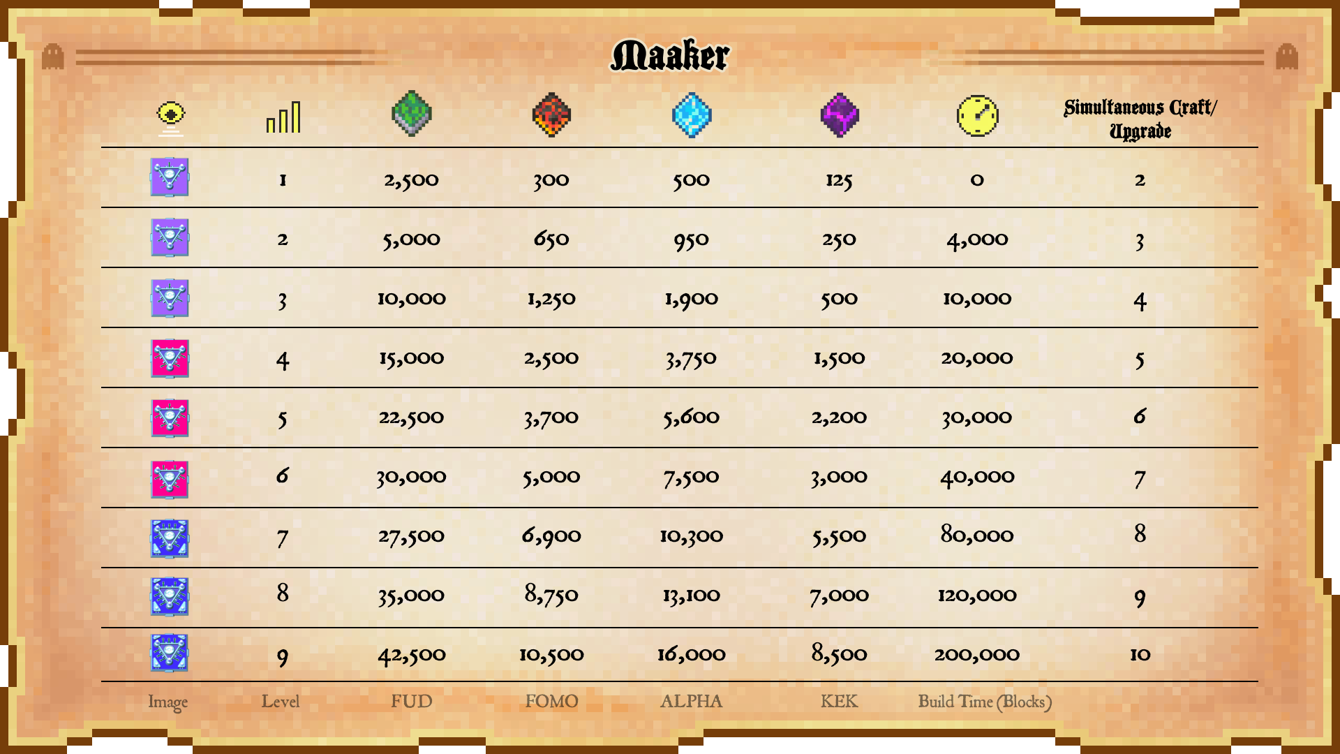By default a player is able to upgrade one Installation at a time. Equipping a Maaker Installation adds Maakerbots to your parcel, increasing the number of simultaneous upgrades that can be performed. The higher the Maaker level, the more upgrades can be performed at the same time. See Appendix for details.