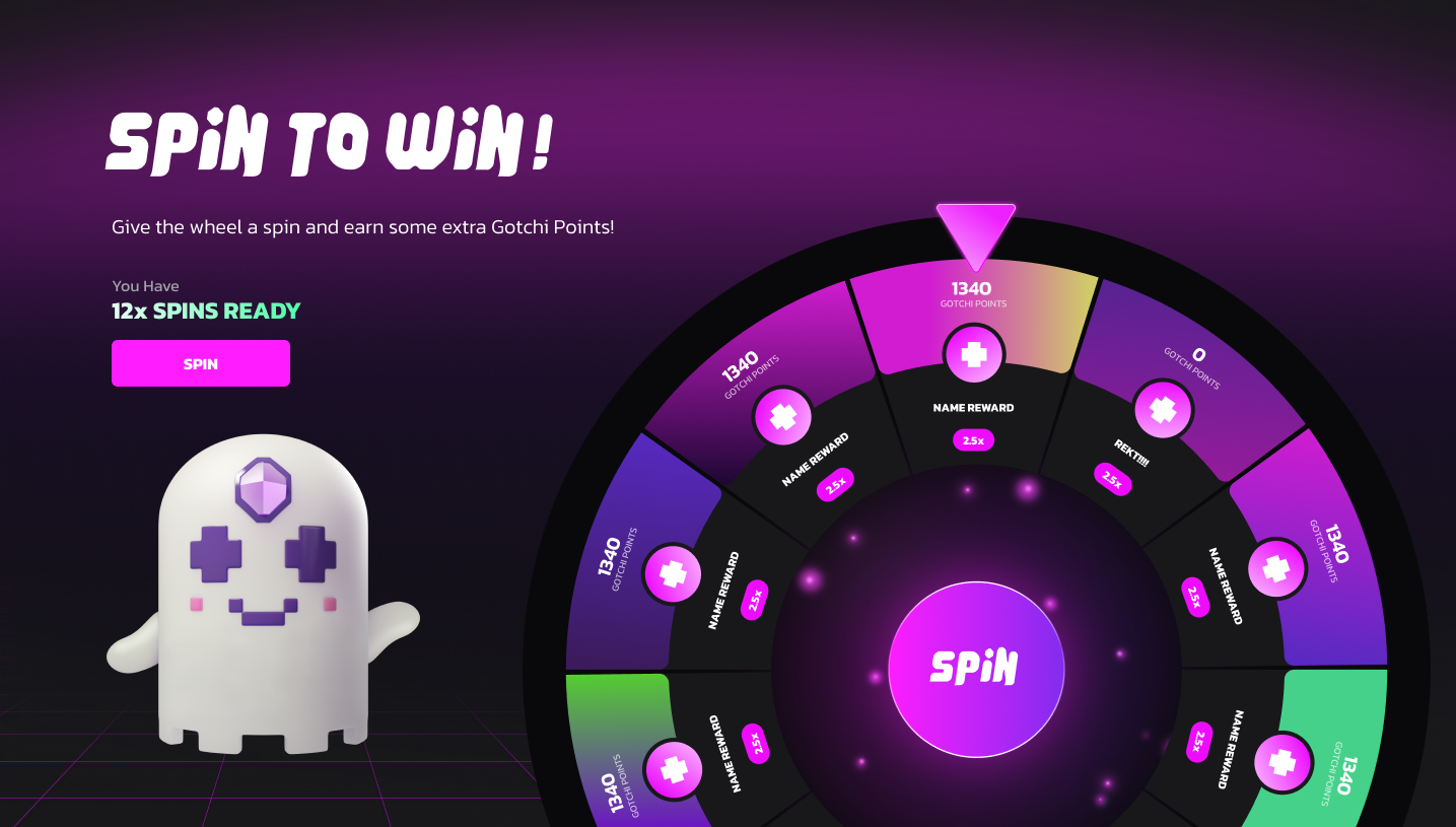 Step 2: Unlock Spins—Achieve in-game milestones to earn badges, which give you spins on the GOTCHI Points Wheel. Step 3: Spin the GOTCHI Wheel: Earn additional GOTCHI points by spinning the wheel!