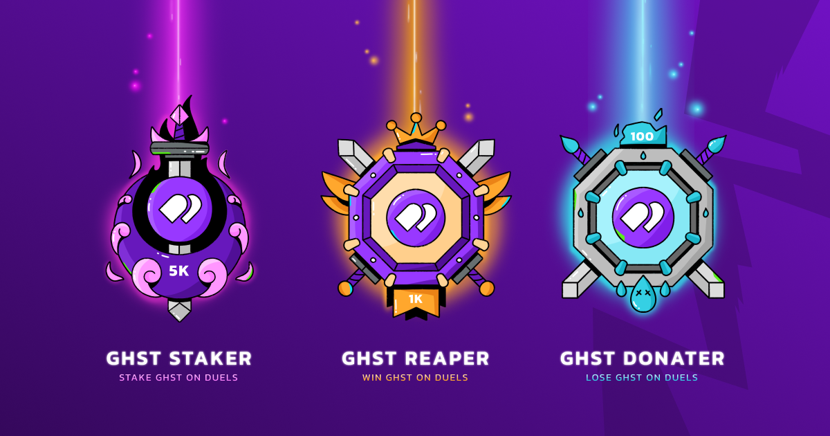 - New Badges: Earn new GHST Reaper, GHST Donator, GHST Staker Badges for winning, losing, and staking GHST in Duels and Battle Royale matches.