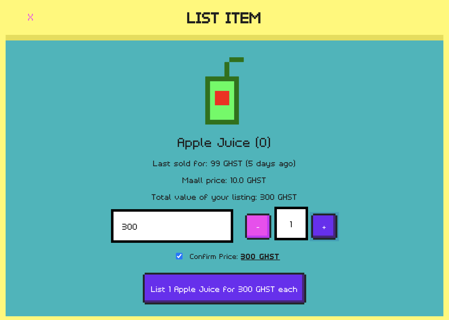 These filters can also come in handy when listing an item for sale. It will allow you to see what prices other people list the same item for so you don’t underprice or overprice your item. For example, let’s say you want to sell a Wearable and you were planning to list it for 100 GHST. Using the search function and price filter, you find that the cheapest list price for that same Wearable is currently 150 GHST. You may decide to increase your list price after finding this information.