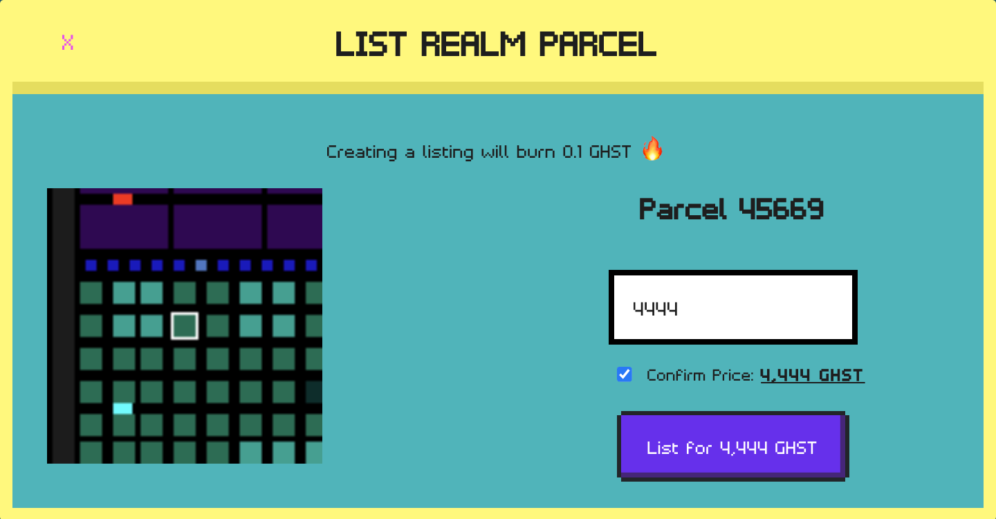 To list Gotchiverse REALM Parcels, you will go to the “My REALM” page and click “List in Baazaar.” From there you will enter your list price in GHST, click the “list for (insert amount) GHST” button, and confirm the transaction.