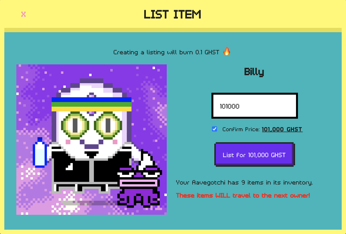To list an Aavegotchi, simply go to your Aavegotchi’s dashboard and click “more” on the bottom right. From there you will selectthe “List in Baazaar” button and input your list price. Next, you will check the “Confirm Price” box and then the “List for (insert amount) GHST” button. Finally, as long as you’re absolutely certain you want to list your Gotchi fren for sale, you will confirm the transaction with the gas fees from your wallet.