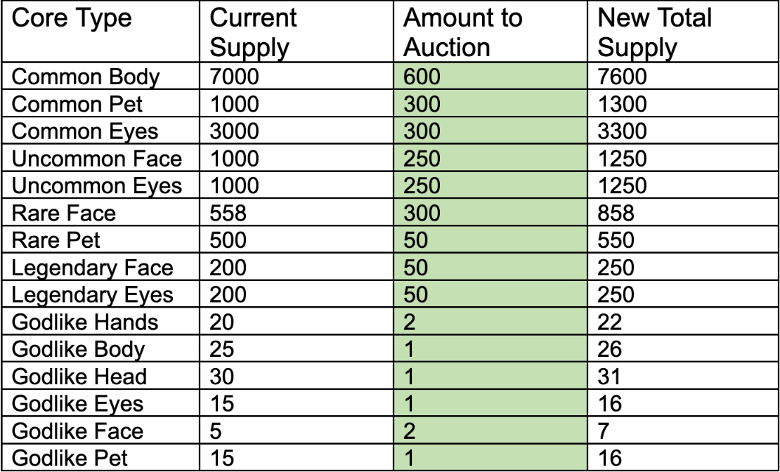 Core: mechanism to control scarcity within each wearable slot and rarity. For example, if no new Mythical Head Cores are released, then the total Mythical Head supply cannot increase.